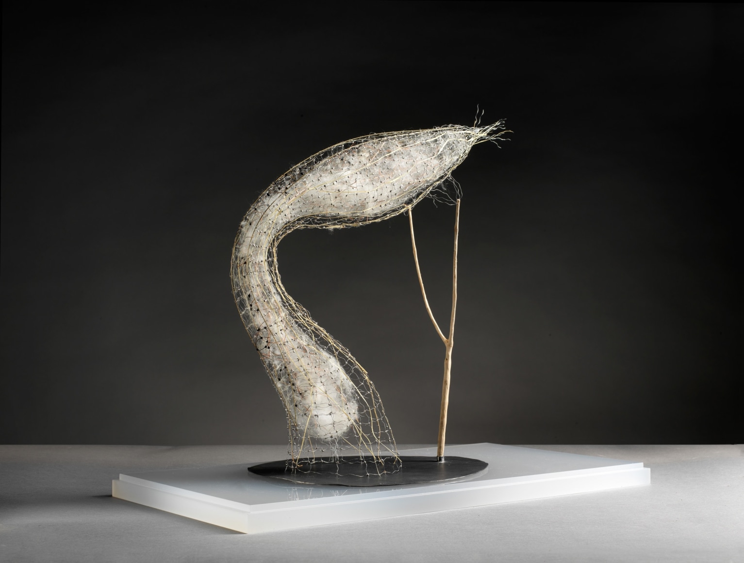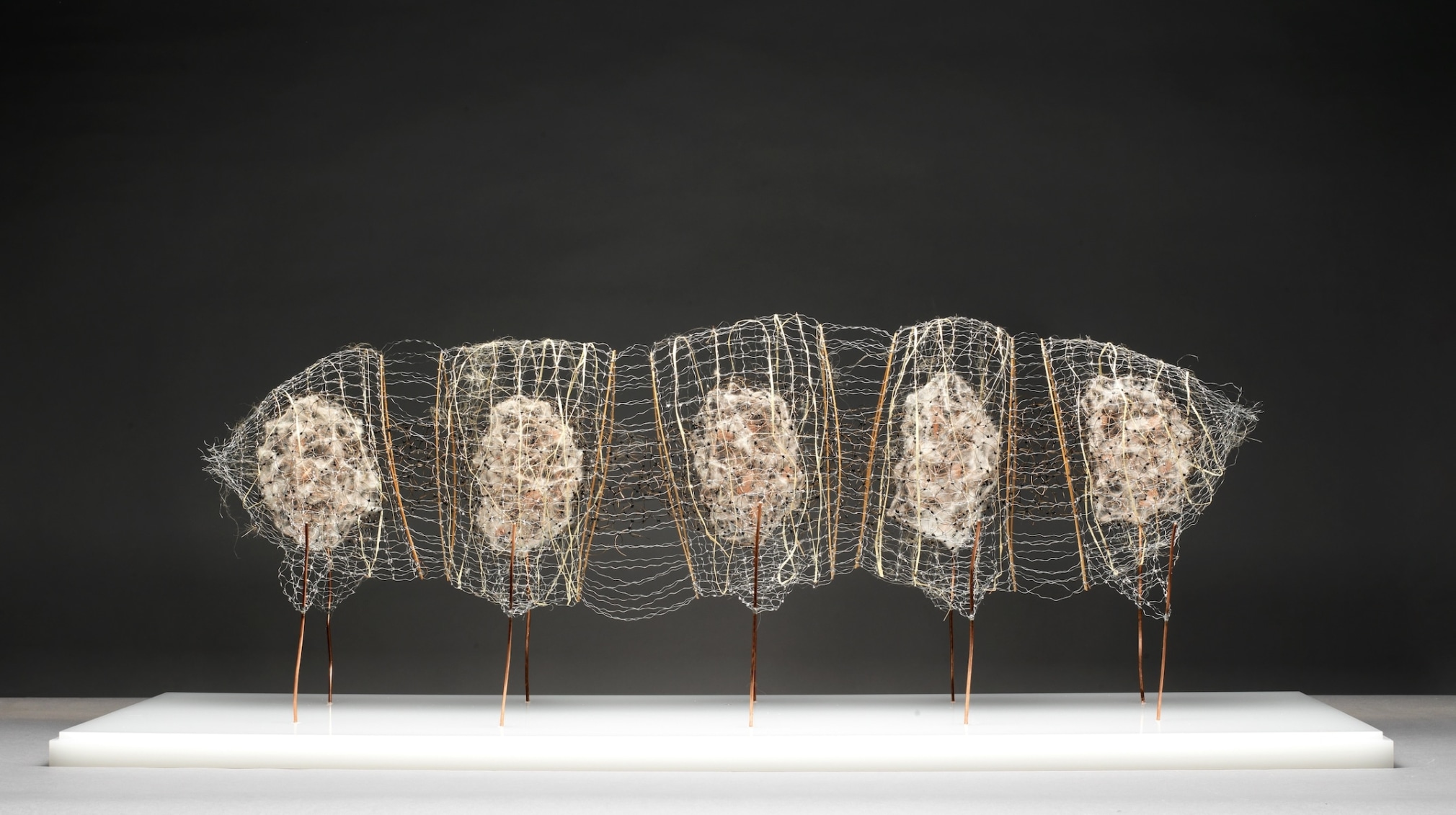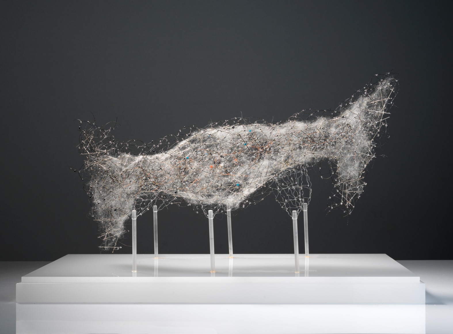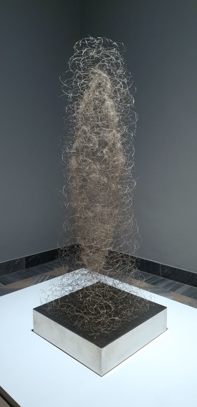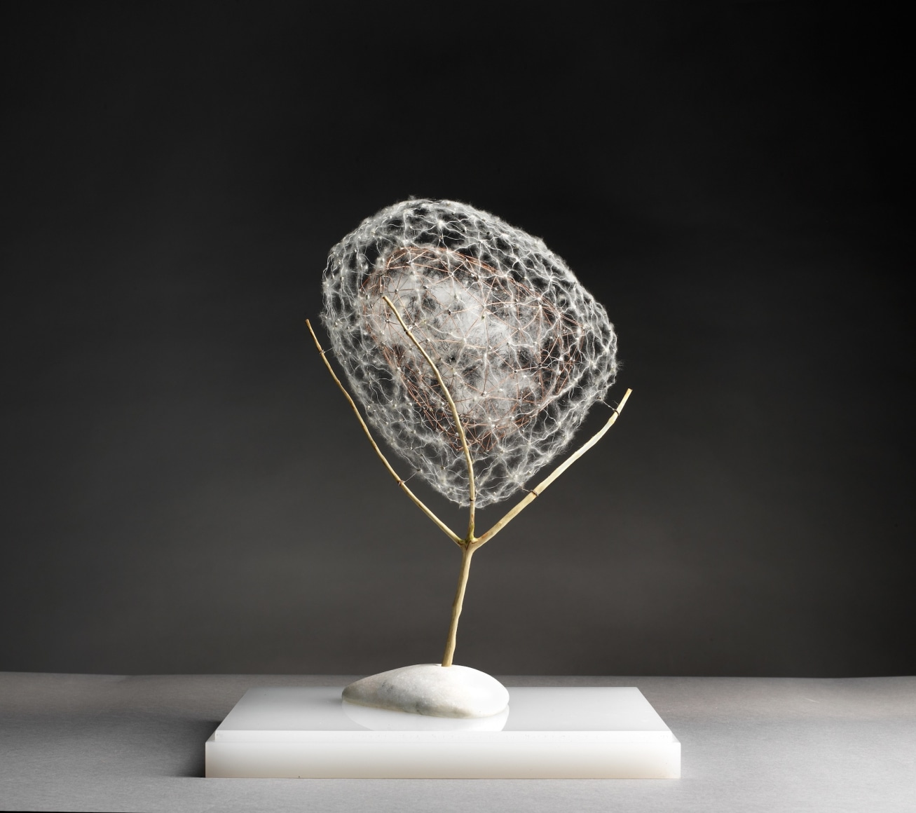 A pleasurable contradiction is created by the artist while focusing his work on the use of lightweight materials such as wire, pins, vegetable fibers and dandelion flowers, which build his particular spatial vision. The complexity of the forms and frameworks that contain and hide his compositions lead us through a visual tour, both interior and exterior, because it is not possible to cover the complexity of the pieces in a sole visual glance.